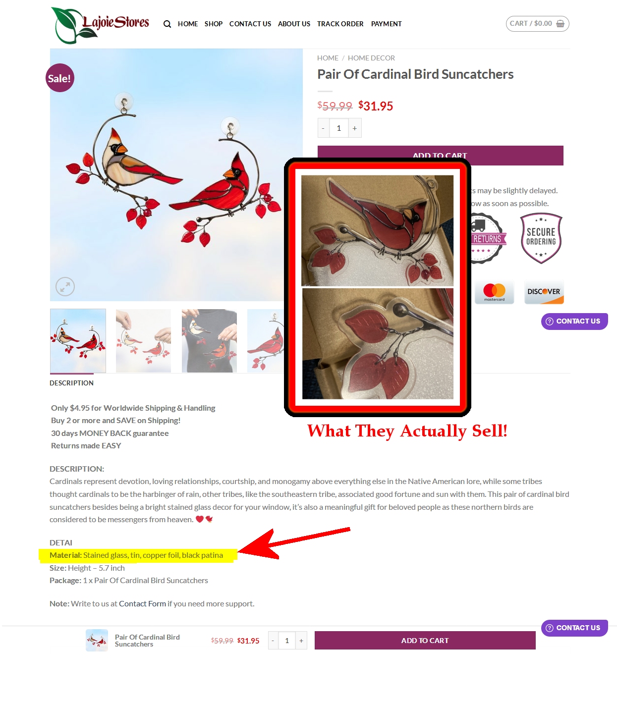 There was no "Stained glass, tin, copper foil, black patina" as advertised.
